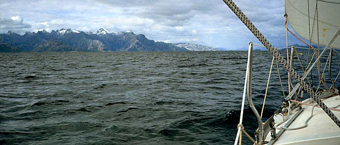 Though the climate in the strait is so fierce, there are better days as well. On both sides of the strait, mountains continue; distant mountains are blue silhouettes, and high mountains have pale-white glaciers. Sometimes, the sunlight spots the rugged slope of the mountain, and the rocks shine gold. In the next moment, clouds hide the sun, and the rocks become brownish violet at once. That was a mysterious scenery. Sailing in such a place in a sailboat must be a fantastic experience.